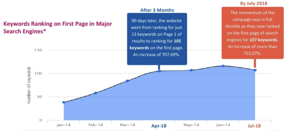 The clinic approached us in January 2018 with some online presence but wanted to enhance their visibility by improving organic rankings, increasing website traffic, and attracting more clientele. At the time of signing up for our SEO services, only 13 keywords were ranking on the first page of major search engines.
